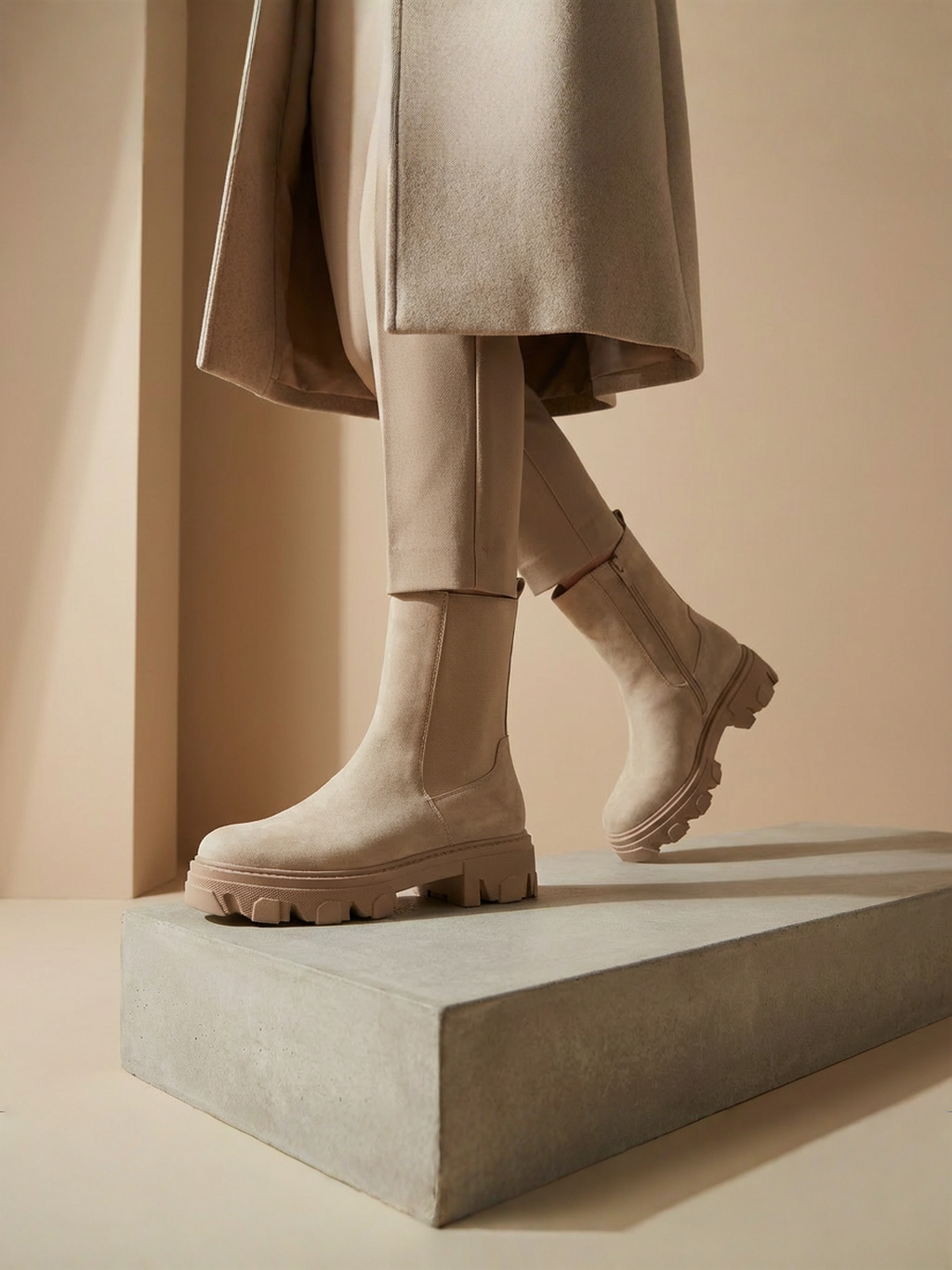 Das minimalistische Design trifft auf eine markant profilierte Oversize-Sohle, die jeden Schritt stabil und kraftvoll wirken lässt. Der hochwertige, matte Lederlook fühlt sich weich an und verleiht dem Stiefel eine edle, reduzierte Ästhetik.